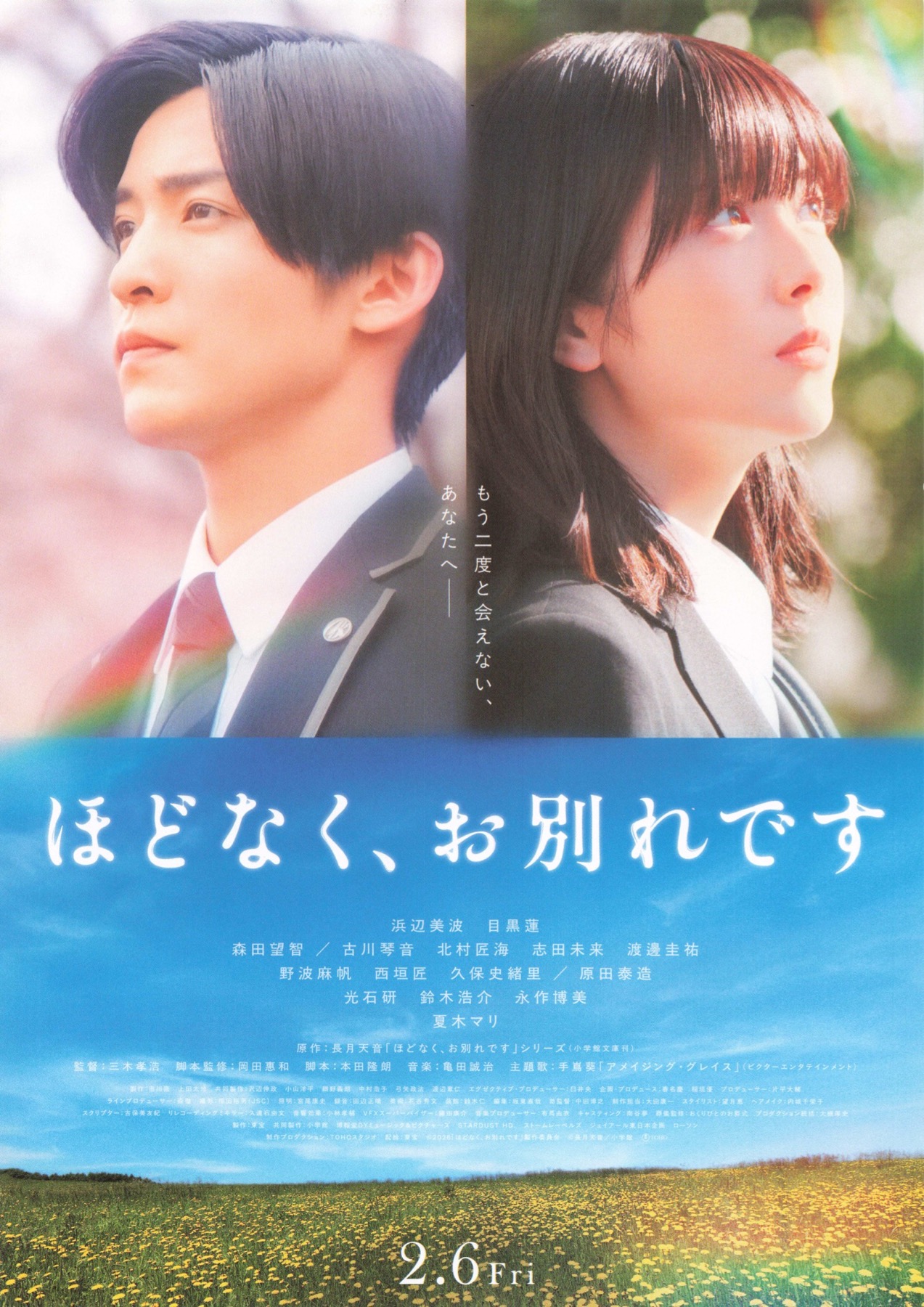 MV 「ほどなく、お別れです」 Author camelus Date 2026年2月21日 サムライプロモーションから出演情報です。 「小学館文庫小説賞」大賞を受賞した長月天音の同名ベストセラー小説を浜辺美波と目黒蓮の主演に迎え、「ソラニン」の三木孝浩監督で映画化。葬儀会社に就職したヒロインが、指南役の葬祭